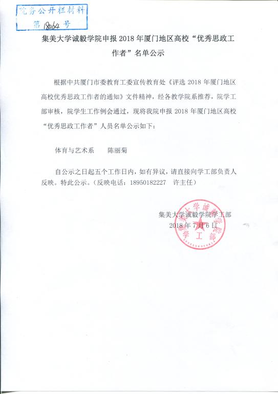 集美大学诚毅学院申报2018年厦门地区高校“优秀思政工作者”名单公示